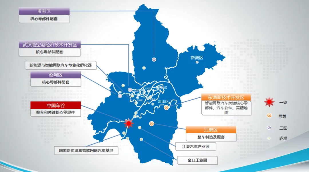 武漢市“一谷兩翼”產業格局奠定基礎,其中經開區“中國車谷”為整車制造及技術研發核心,江夏、東湖新技術開發區為關鍵零部件及配套設施的動力支撐。重點布局新能源與智能網聯汽車創新產業園、車規級芯片產業園、光谷智能網聯汽車軟件產業園、智能網聯智造園等重點園區載體,大力發展整車制造+三電系統、車規級芯片、汽車軟件及高精地圖、智能網聯汽車零部件等產業。同時聯動“三區多點2”,打造臨空港汽車產業園、中德國際產業園、新能源汽車十里長廊等一批具有特色功能的重點園區,提升產業韌性。