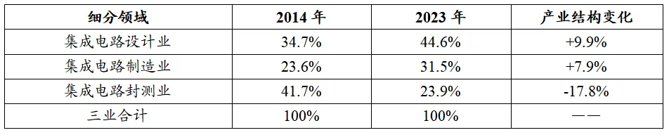 表1 2014-2023年我國集成電路產業(yè)三大主業(yè)產業(yè)結構情況