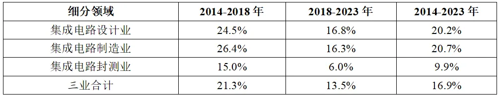 表2 2014-2023年我國集成電路產業(yè)三大主業(yè)銷售收入年均復合增速情況