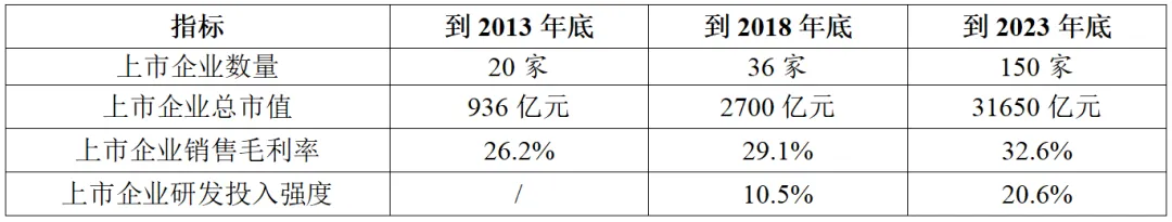 資本市場助力產業(yè)升級,上市企業(yè)數(shù)量質量雙飛躍。根據(jù)東方財富金融數(shù)據(jù)統(tǒng)計(表4),截止到2013年底,我國實現(xiàn)A股上市的半導體企業(yè)僅有20家,總市值不足千億元,平均銷售毛利率26.2%。而到2023年底,上市企業(yè)數(shù)量超過150家,總市值超過3萬億元,平均銷售毛利率32.6%。尤其是2018-2023年,由于科創(chuàng)板的設立,帶動集成電路產業(yè)在資本市場實現(xiàn)“加速跑”,5年間上市企業(yè)數(shù)量和總市值分別實現(xiàn)超過4倍和10倍的增長,上市企業(yè)平均銷售毛利率和研發(fā)投入強度也實現(xiàn)大幅躍升。
