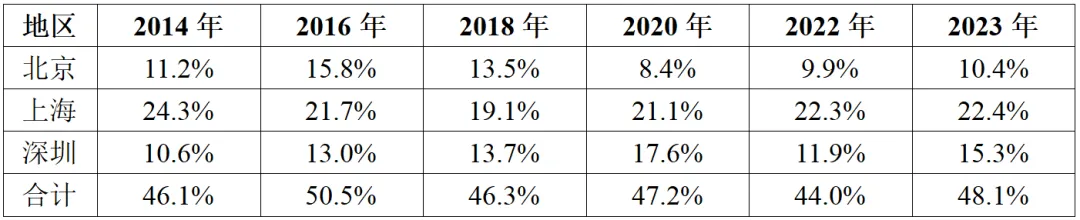 表6 2014-2023年北京、上海、深圳集成電路設計、制造、封測三大主業(yè)銷售收入占全國比重情況