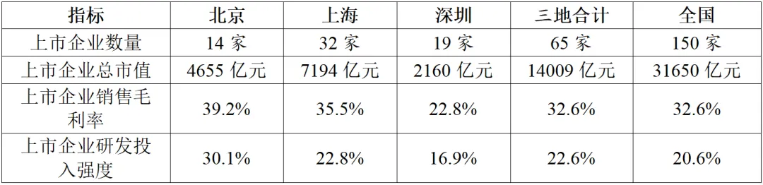 在企業(yè)發(fā)展方面,北京上市企業(yè)發(fā)展質量最高,上海上市企業(yè)數(shù)量和總市值最多。根據(jù)東方財富數(shù)據(jù)(表7),截止到2023年底,北京、上海、深圳分別擁有14家、32家、19家半導體領域的上市企業(yè),總市值分別為4655億元、7194億元、2160億元,合計上市企業(yè)數(shù)量和總市值占到全國的40%以上。其中上海上市企業(yè)的數(shù)量和總市值最多,而北京的上市企業(yè)發(fā)展質量最高,銷售毛利率和研發(fā)投入強度分別達到39.2%和30.1%,遠超全國平均水平。