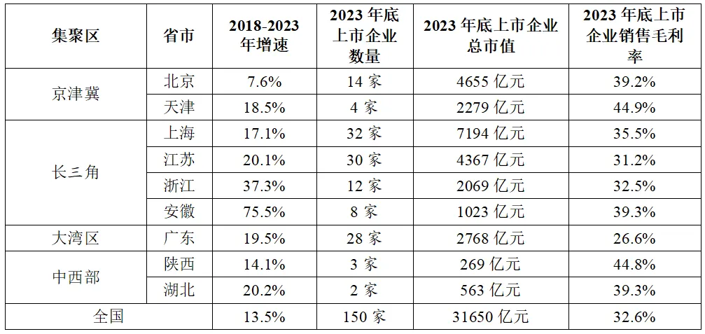 從企業(yè)發(fā)展來看,京津冀和中西部上市企業(yè)發(fā)展較為優(yōu)質,中西部上市企業(yè)數(shù)量和總市值仍有上升空間。根據(jù)東方財富數(shù)據(jù)(表9),截止到2023年底,在我國150家半導體上市企業(yè)中,82家來自長三角地區(qū),占比接近一半,總市值占比也接近一半。而京津冀和中西部上市企業(yè)的銷售毛利率遠超國內全行業(yè)上市企業(yè)平均水平,企業(yè)質量較為優(yōu)質。但中西部地區(qū)的上市企業(yè)數(shù)量和總市值與其他地區(qū)存在較為明顯的斷層差距,仍存在一定的上升空間。
