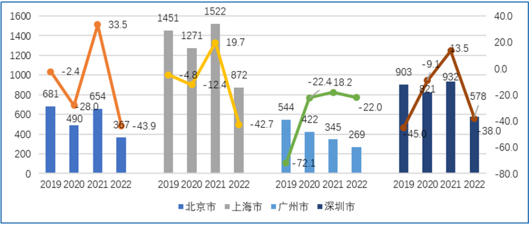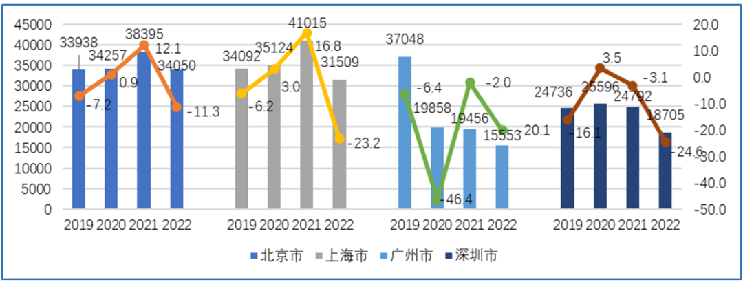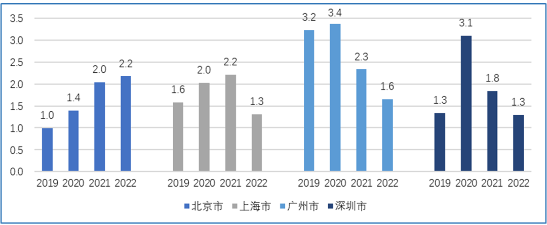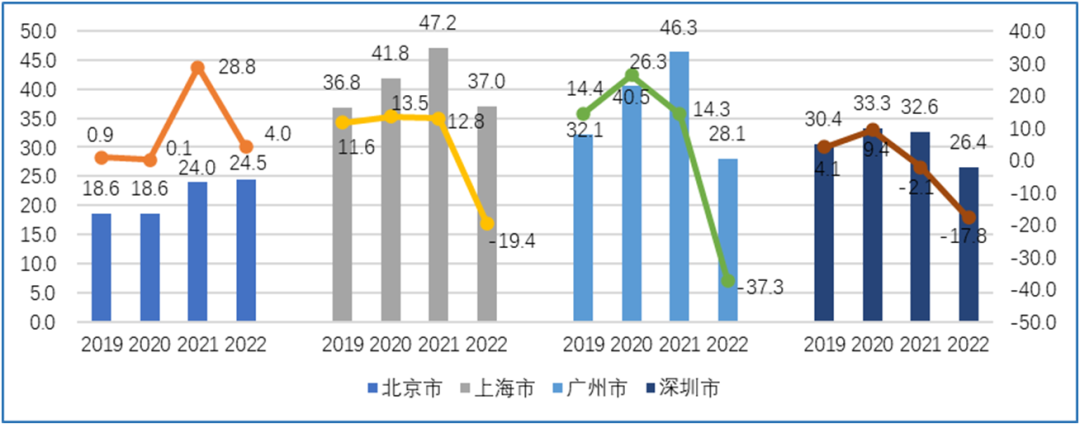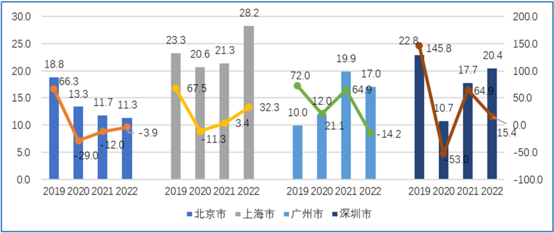 四城市新設企業增速放緩,城市發展內生動力減弱。上海市、廣州市的企業新設量變動趨勢一致,均經歷了2019-2021年的高速增長后,在2022年出現較大幅度的下滑;北京市是四城市中唯一實現企業新設量逐年上漲的城市,但絕對量仍低于其他城市;深圳市企業新設量的下滑始于2021年,2022年下降幅度進一步增加。預計2023年后,隨著疫情防控政策逐步放開,四城市作為營商環境創新試點的改革持續深化,市場主體活力將進一步被釋放,企業新設量將快速恢復增長。