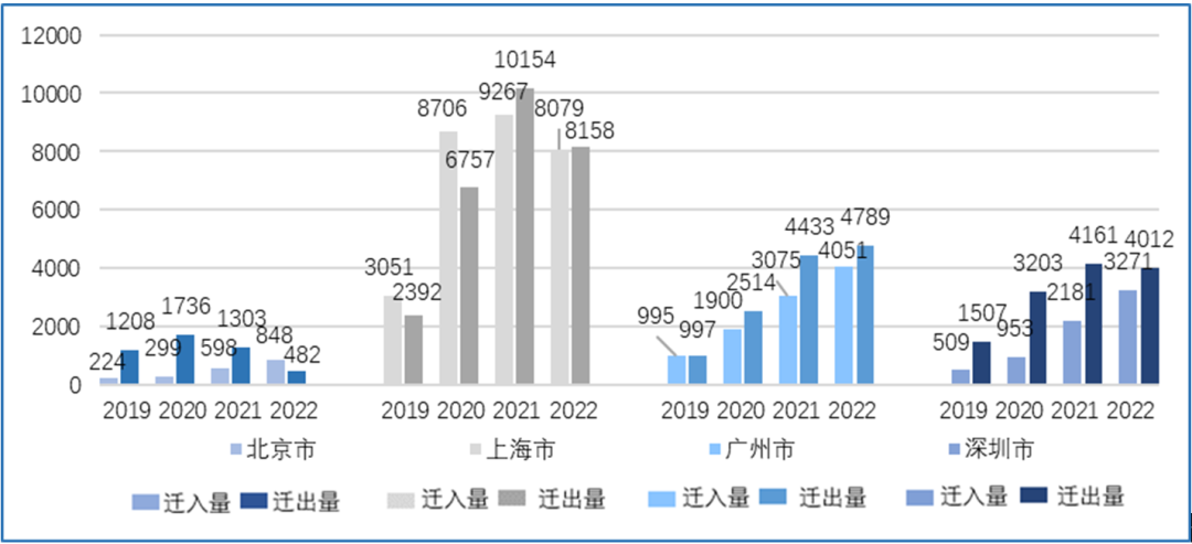 圖5  2019-2022年北上廣深企業遷入及遷出量(家)