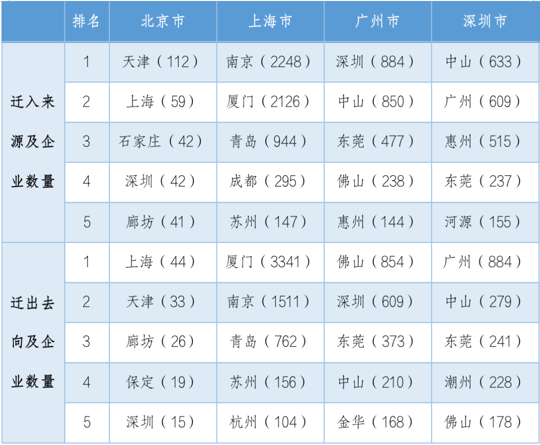 表1  2022年北上廣深企業遷移企業數量排名前五的城市