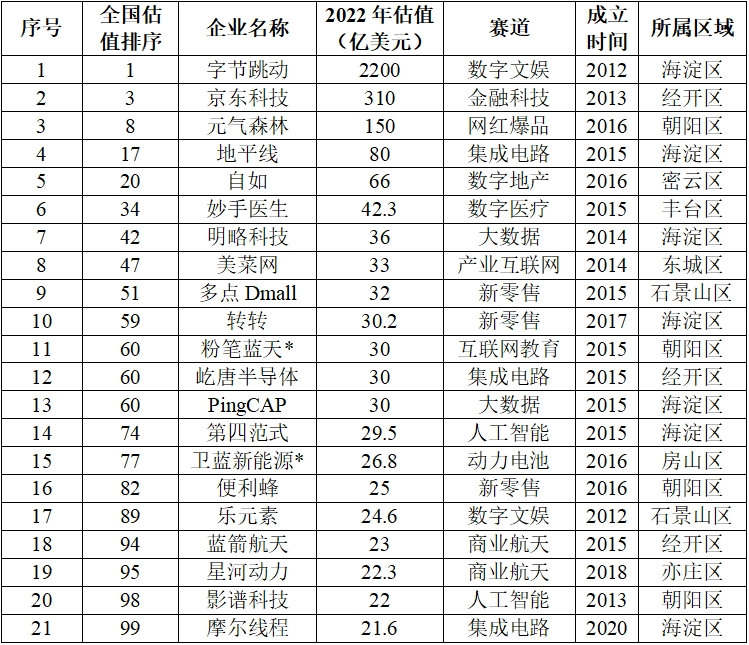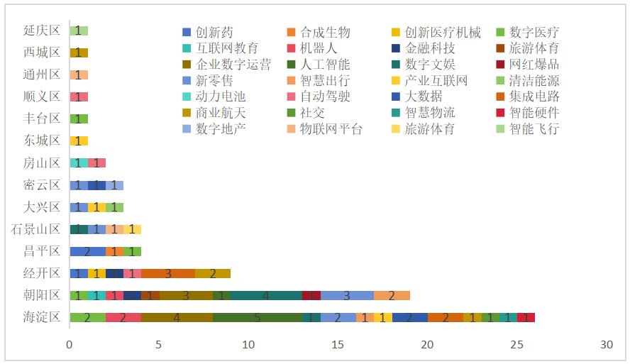 圖1 2022年北京市獨角獸企業空間及賽道分布