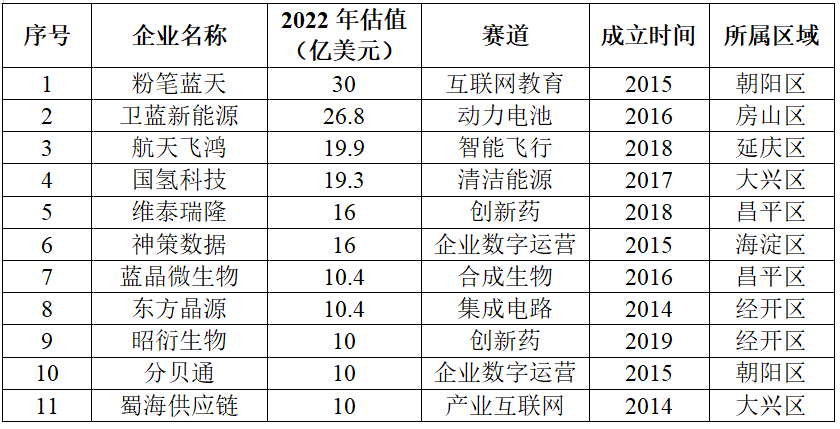 2022年北京新晉11家獨角獸企業,分布于9個賽道。其中,創新藥和企業數字運營賽道各新晉2家,互聯網教育、動力電池、智能飛行、清潔能源、合成生物、集成電路、產業互聯網等賽道各新晉1家。從分布區域來看,大興區、經開區、朝陽區、昌平區等4個區各新晉2家,海淀區、房山區、延慶區等3個區各新晉1家。昌平區維泰瑞隆、經開區昭衍生物2家新晉創新藥獨角獸企業于近5年成立,昌平區新晉藍晶微生物獨角獸企業,近幾年北京市醫藥健康前沿領域發展較好。