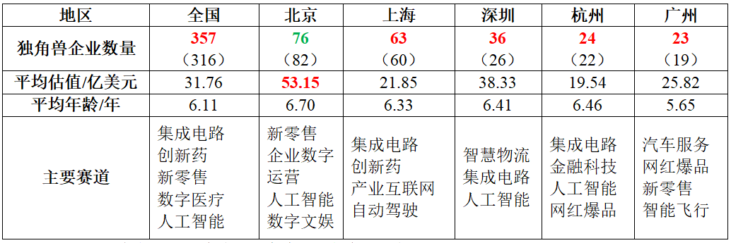 注:括號內表示2021年全國及各城市獨角獸企業數量