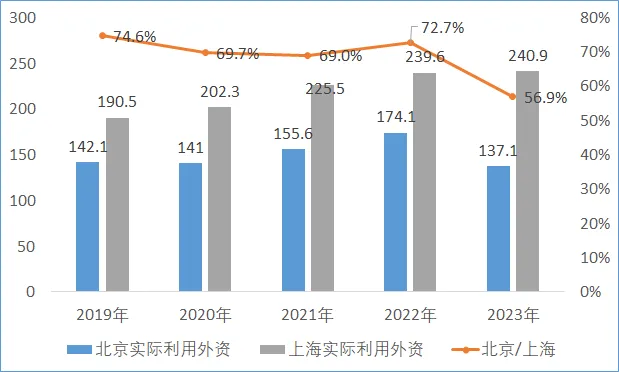 2023年,北京市新設外資企業1729家,比上年增長22.8%,實際利用外商直接投資137.1億美元,下降21.2%;上海市新設外商投資企業6017家,比上年增長38.3%,全年外商直接投資實際到位金額240.87億美元,增長0.5%。從2019-2023年時間序列數據來看,北京市利用外資波動較大,且與上海市的差距在拉大。2019-2022年,北京市利用外資約為上海市的70%左右,2023年,北京市利用外資下降至上海市的57%。從兩地利用外資增速來看,近五年,上海市一直維持正增長,北京市有3年為負增長,其中2019年、2023年兩年增速分別為-17.9%、-21.3%。