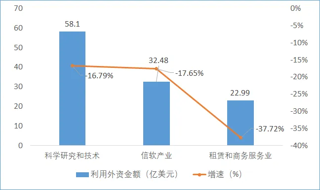 2023年,北京市實際利用外資金額排名前三的行業分別為科學研究和技術服務業,信息傳輸、軟件和信息技術服務業,租賃和商務服務業,實際利用外資金額分別為58.1億美元、32.48億美元和22.99億美元,合計占比為82.8%,增速分別為-16.79%、-17.65%和-37.72%;上海市實際利用外資金額排名前三的行業分別為信息傳輸軟件和信息技術服務業、租賃和商務服務業、科學研究和技術服務業,實際利用外資金額分別為53.59億美元、46.1億美元和46.02億美元,合計占比為60.5%,增速分別為6%、-23.5%和-21.1%。