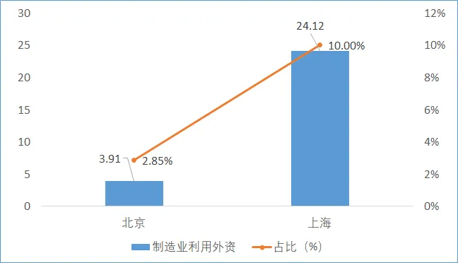 圖6 2023年北京市和上海市制造業利用外資(億美元)及占比