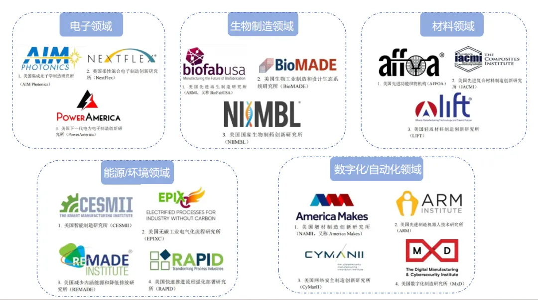 2012年美國計劃通過建立15個制造業創新研究所,打造覆蓋全美的制造業創新網絡。截至2023年11月,美國已設立17個制造業創新研究所,覆蓋電子、材料、能源/環境、數字化/自動化、生物制造領域。