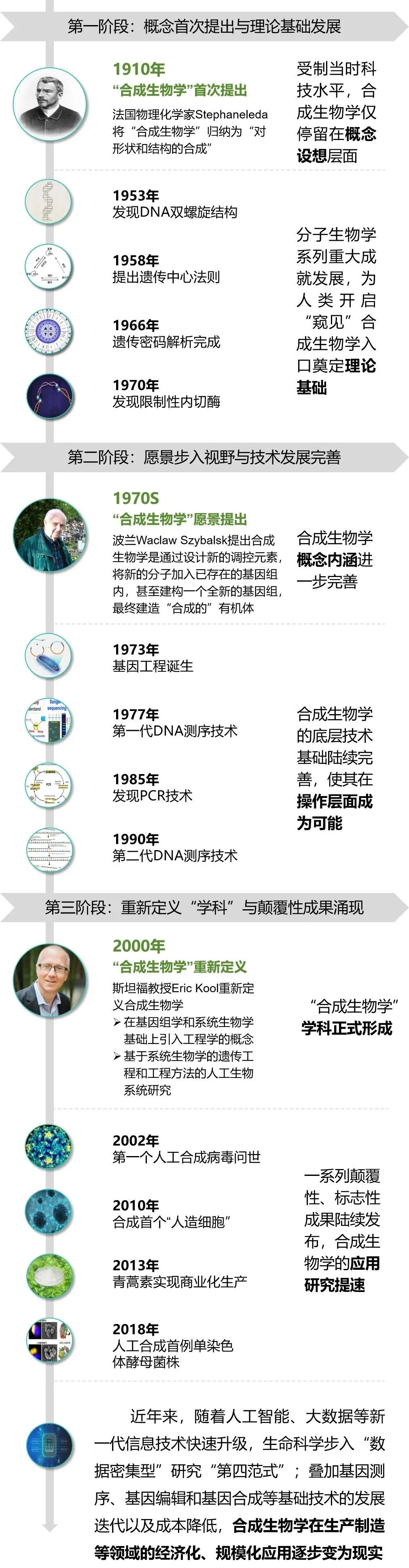 合成生物學自概念提出到現在發展歷史已超百年。最早可溯源至19世紀中葉合成化學的出現打破無機物和有機物的界限,推翻“生命力論”,顛覆了人類對生命體(動物、植物、微生物等)的認知。此后,“細胞學說”“生物化學”“遺傳學說”等相繼提出,人類從細胞層面、分子層面實現對生命體認識的飛躍,合成生物學亦隨之演化。總體看,合成生物學發展歷程大致可分為三大階段: