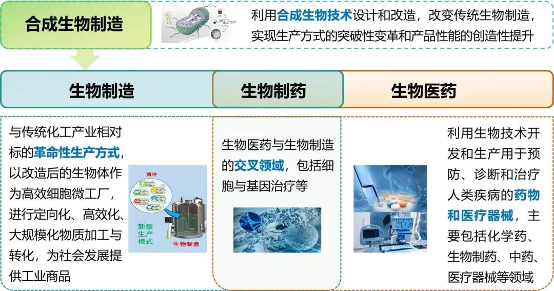從產業范疇看,合成生物學是生物制造最重要的底層技術之一,生物制造是合成生物技術的主要應用場景。合成生物制造隸屬于生物制造,與生物醫藥產業存在交叉重疊的關系。