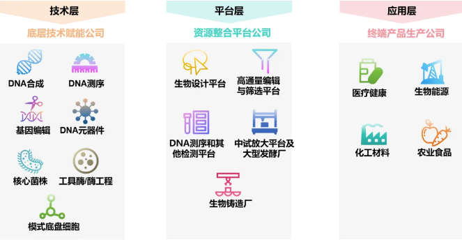 伴隨生物學、生物信息學、計算機、化學等學科的快速發展,合成生物在經濟社會中加速應用滲透,逐步用于加工或合成化學品、藥品、食品、生物能源等產品,為解決資源短缺、環境污染等問題提供了新的解決方案。根據不同類型企業在合成生物相關產業中的不同作用,可以大致將產業鏈條分為技術層、平臺層、應用層三個層級。