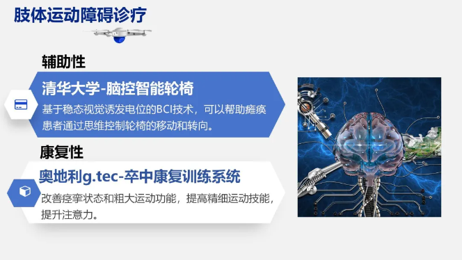 當前的研究和應用多為非侵入式,主要分為輔助性和康復性兩類,是業(yè)界進展相對較快的領域。輔助性BCI著重于替代或增強物理功能,通過捕捉患者的運動意圖,進而控制外部設備如假肢或外骨骼等。康復性BCI則專注于通過神經(jīng)康復訓練恢復或改善患者的運動能力,利用中樞神經(jīng)系統(tǒng)的可塑性,通過重復性刺激來強化神經(jīng)元之間的突觸連接,促進修復。