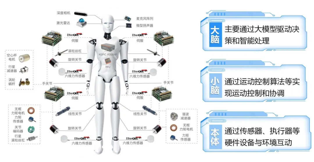 具身智能在架構(gòu)上可以分為“大腦”“小腦”和“本體”。依托三者協(xié)同配合,機(jī)器人才能像人類一樣去面對(duì)各項(xiàng)需求,完成各類任務(wù)。其中,“大腦”主要通過(guò)大模型驅(qū)動(dòng)決策和智能處理;“小腦”通過(guò)運(yùn)動(dòng)控制算法等實(shí)現(xiàn)運(yùn)動(dòng)控制和協(xié)調(diào);“本體”通過(guò)傳感器、執(zhí)行器、靈巧手等硬件設(shè)備實(shí)現(xiàn)與環(huán)境互動(dòng)。