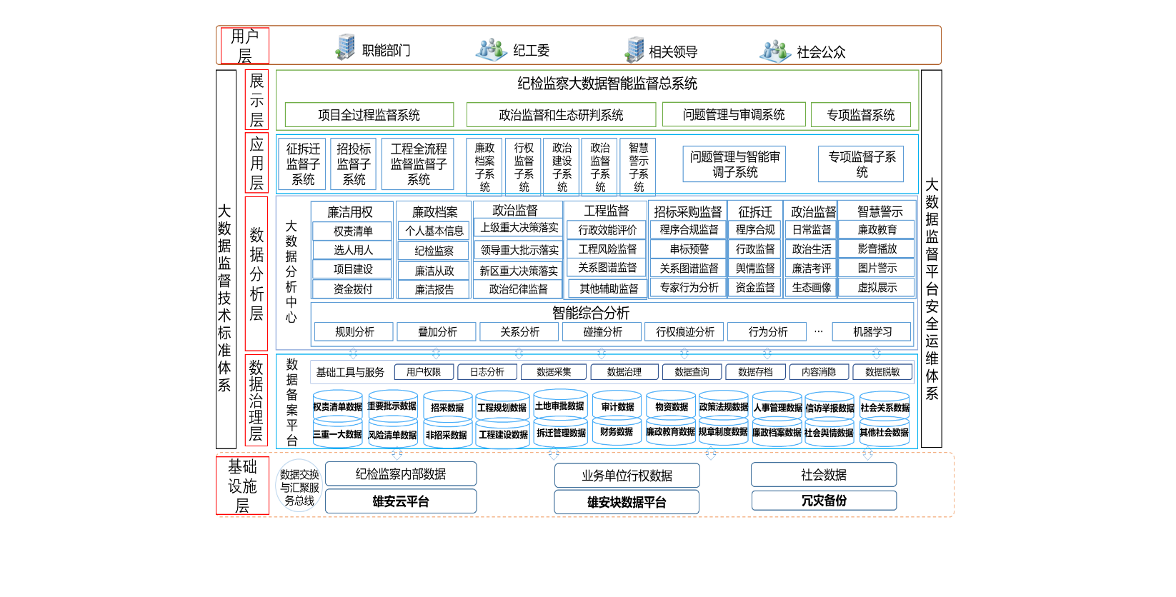 項目總體立足紀檢工作的全過程監督和政治監督,運用信息技術手段建設雄安新區紀檢大數據智能監督系統,系統分三期建設。本項目為一期建設,建設內容包括大數據智能監督分析中心、項目全過程監督系統、專項監督系統和系統管理平臺。