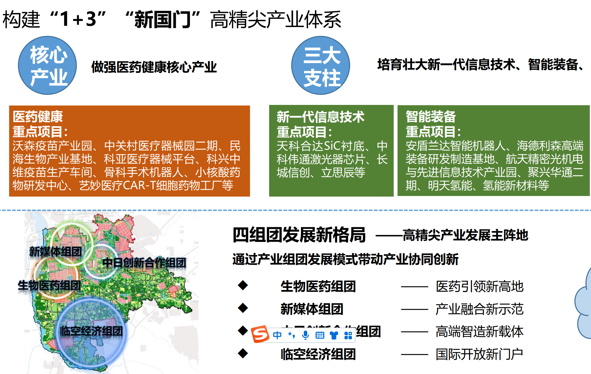 規劃梳理總結大興區高精尖產業現狀和形勢,提出大興區未來發展思路目標、重點方向和布局、發展路徑及保障措施。即把握北京“兩區”建設重大契機,深入實施“產業強區”戰略,充分發揮機場交通樞紐新門戶作用,做強醫藥健康核心產業,培育新一代信息技術、智能裝備和科技服務支柱產業,構建“1+3”高精尖產業體系,打造科技創新“新高地”、首都發展“新空間”、對外開放“新門戶”。