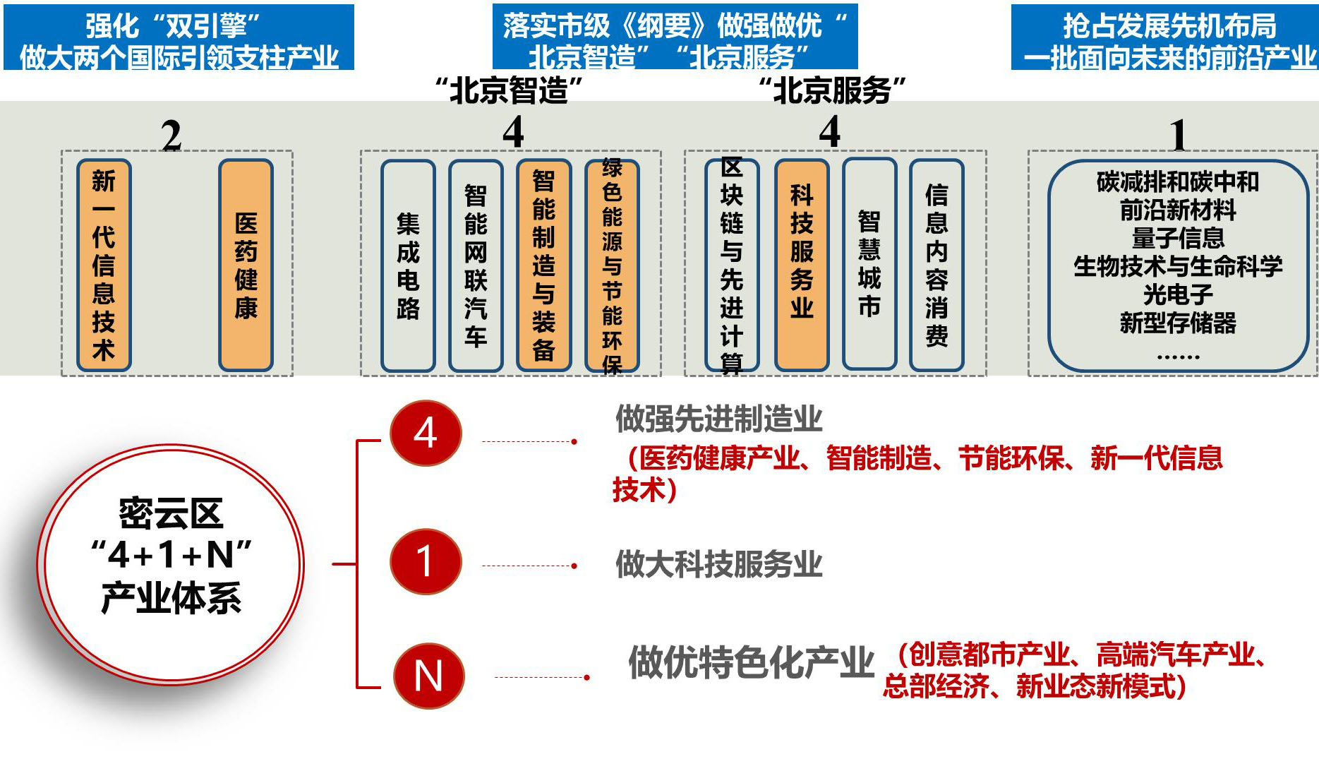 規劃梳理總結密云區高精尖產業現狀和形勢,根據市委對生態涵養區“不斷擴大生態環境容量和提高生態環境質量”的新要求,提出堅持科技創新、生態融合兩條主線,加快推進創意都市、汽車零部件等傳統產業轉型升級,以醫藥健康、智能制造、節能環保、新一代信息技術產業為主導,以科技服務業為支撐,以新業態、新模式為補充,構建“4+1+N”的高精尖產業體系和“3+5+4”的高精尖產業空間體系,推動密云綠色創新發展示范區建設。