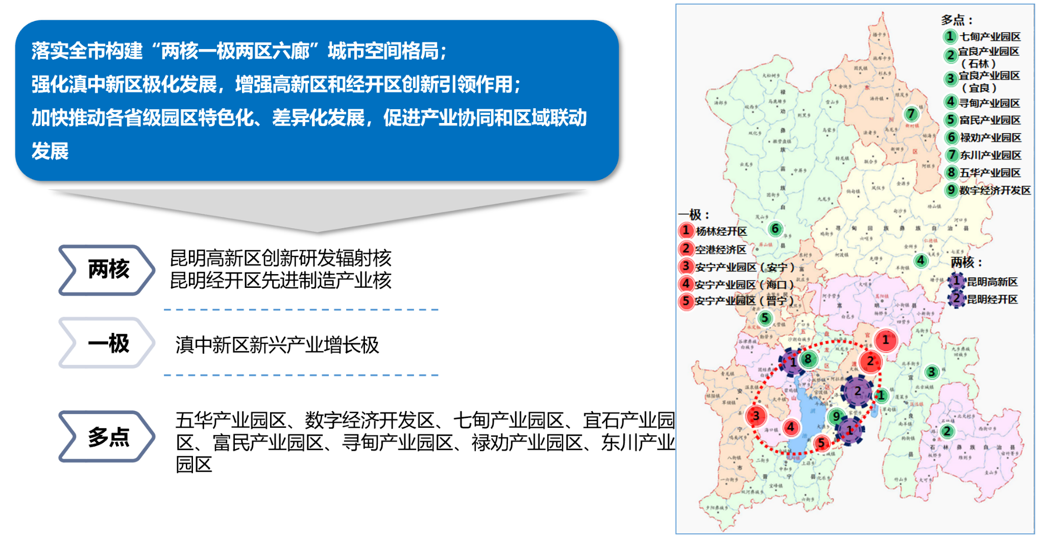 規(guī)劃貫徹習(xí)近平總書記考察云南重要講話精神,以服務(wù)昆明區(qū)域性國際中心城市建設(shè)目標(biāo),明確提出著力打造“兩核一極多點(diǎn)”空間格局;以優(yōu)化“3+2+4”產(chǎn)業(yè)布局為主攻方向,培育九大工業(yè)產(chǎn)業(yè)集群的發(fā)展思路和舉措。